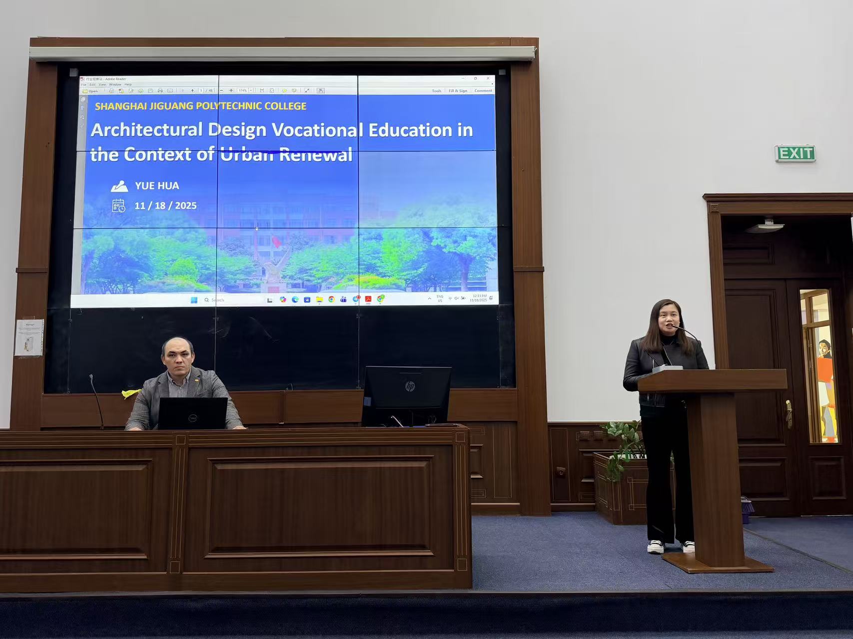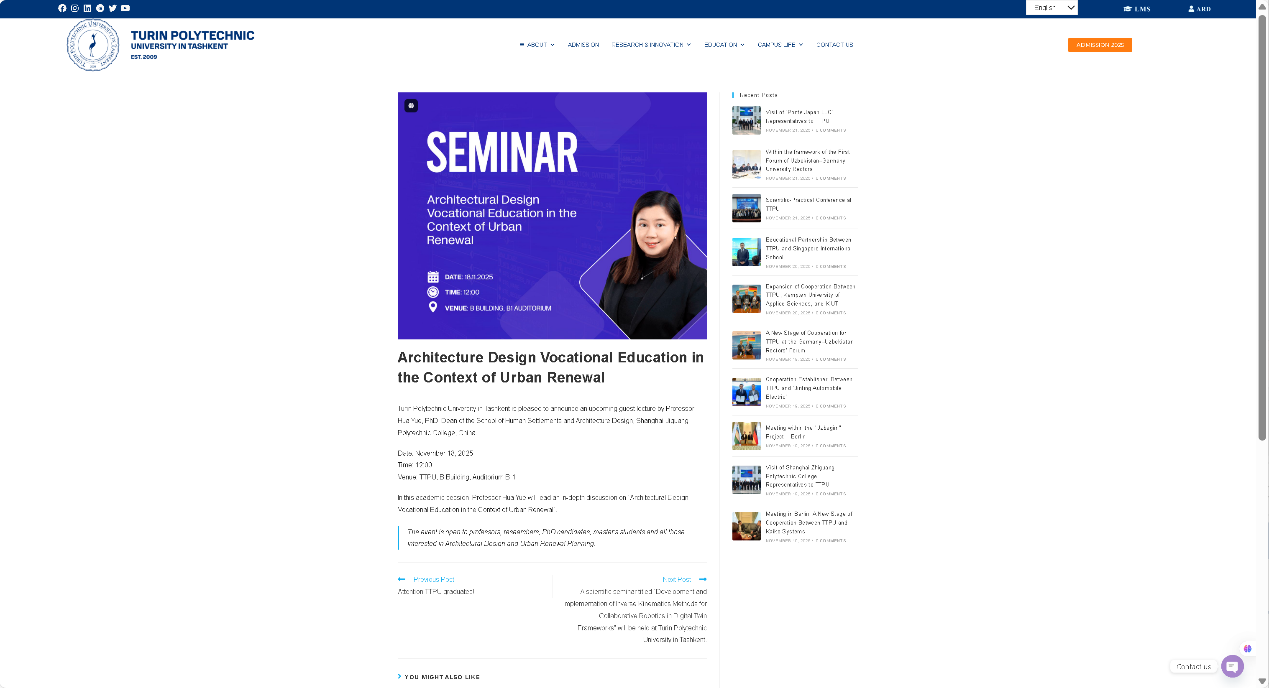 2025年11月18日,人居环境与建筑设计学院团队受邀赴乌兹别克斯坦塔什干都灵理工大学开展专业讲座。塔什干都灵理工大学作为乌兹别克斯坦建筑工程类院校,是我国教育部认可的中亚优质高校。人居环境与建筑设计学院联合上海华东建筑设计研究院、上海一造科技有限公司共组校企团队,向当地师生分享城市更新背景下中国建筑设计领域的数智技术与职业教育经验,以切实举措服务“一带一路”,助力职教出海,推动上海建筑设计职业教育走向国际舞台。此次学术交流活动也是我校深化与塔什干都灵理工大学校际合作的重要内容。