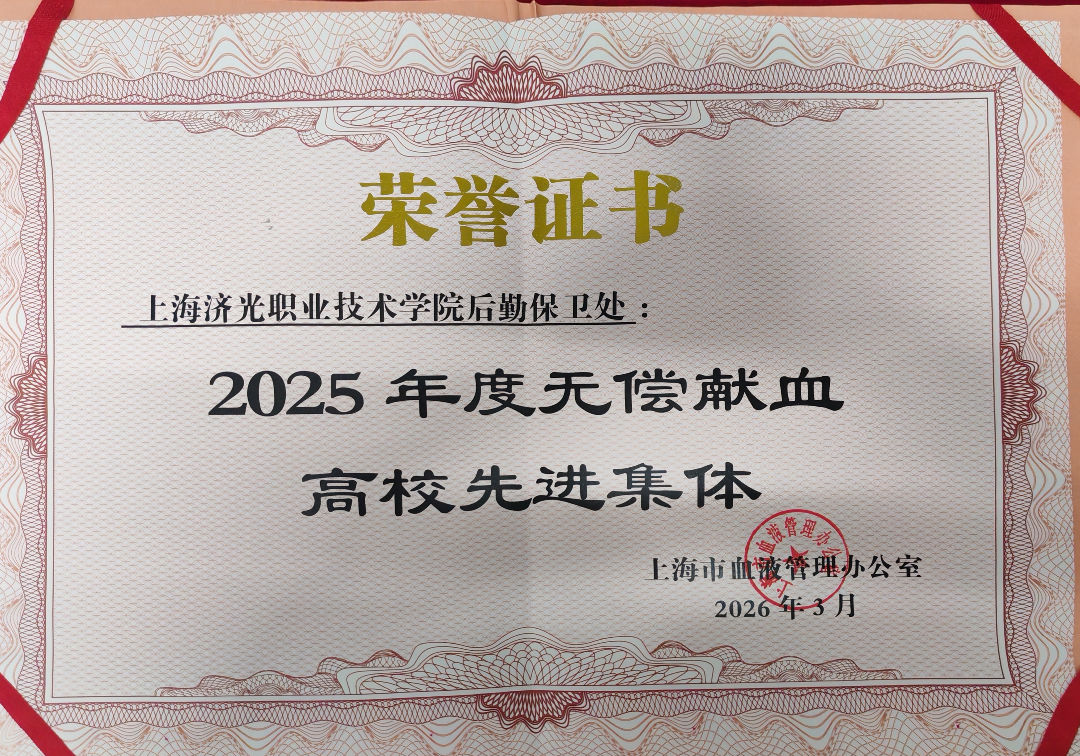 近日,上海市血液管理办公室公布2025年度无偿献血表彰结果,我校后勤保卫处荣获“2025年度无偿献血高校先进集体”荣誉称号,这份沉甸甸的荣誉,是对我校长期以来积极践行社会责任、助力公益事业的高度肯定。