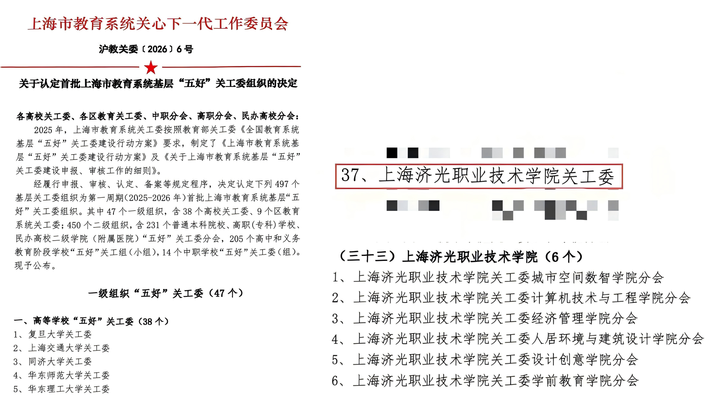 2026年3月23日,上海市教育系统关心下一代工作委员会印发《关于认定首批上海市教育系统基层“五好”关工委组织的决定》(沪教关委【2026】6号),公布首批基层“五好”关工委组织认定结果。上海济光职业技术学院关工委获批一级组织“五好”关工委,校关工委城市空间数智学院分会、计算机技术与工程学院分会、经济管理学院分会、人居环境与建筑设计学院分会、设计创意学院分会、学前教育学院分会荣获二级组织“五好”关工委。