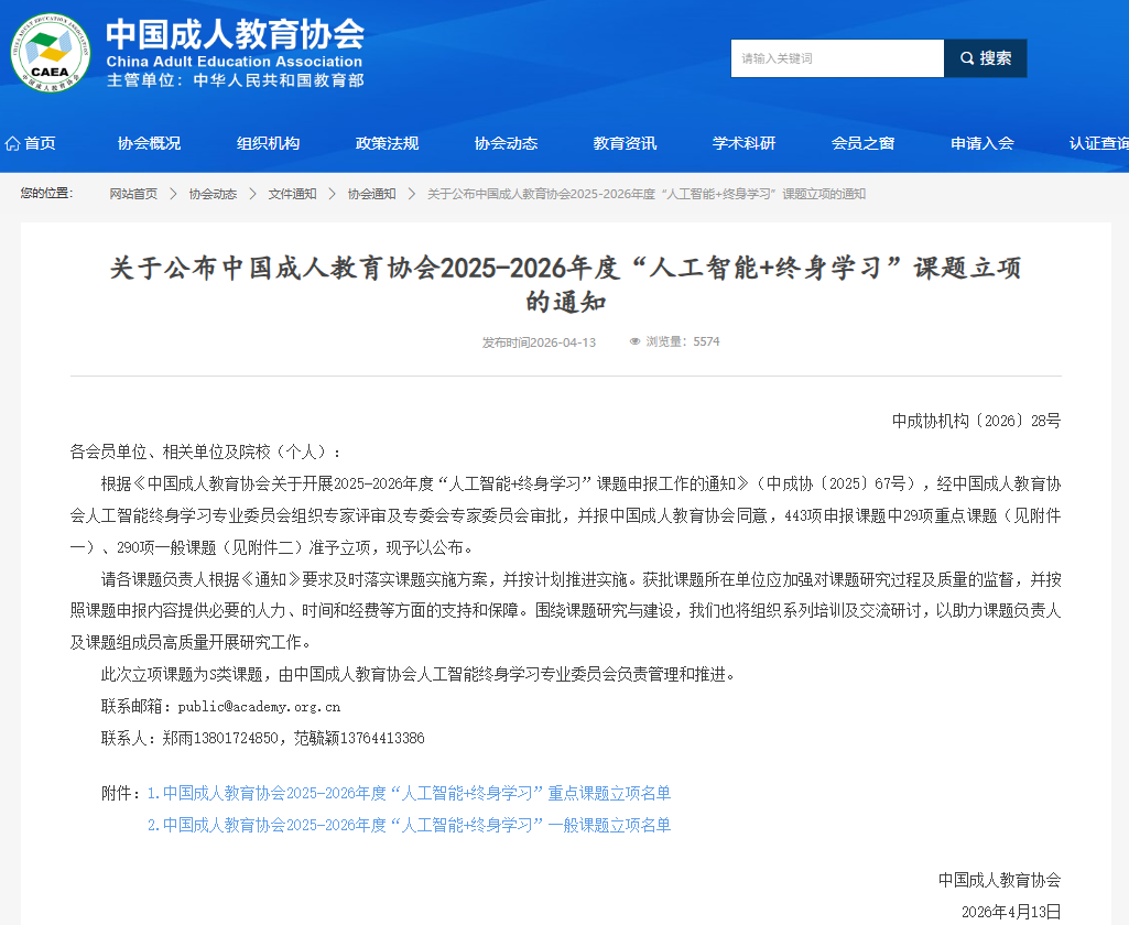 近日,中国成人教育协会正式公布了2025-2026年度“人工智能+终身学习”课题立项名单(中成协机构〔2026〕28号),我校成功获批1项重点课题及4项一般课题立项。