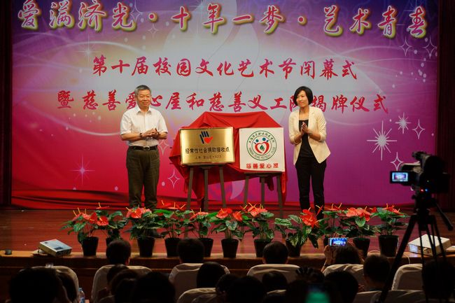 今年的校园文化艺术节,展现了浓浓的人文情怀,把“爱心、慈善、服务”等元素融入其中。在校园文化艺术节的闭幕式上,也迎来了我校慈善爱心屋和慈善义工队揭牌仪式。上海市慈善基金会宝山分会常务副秘书长袁建民、学生处处长王琛共同为我校慈善爱心屋和经常性社会捐助接收点揭牌。随后,上海市慈善基金会副秘书长刘淑英为我校慈善义工队授旗,我校义工代表在上海志愿者的旗帜进行了庄严宣誓:在社会需要的时候,挺身而出; 在困难群众需要的时候,奉献爱心……