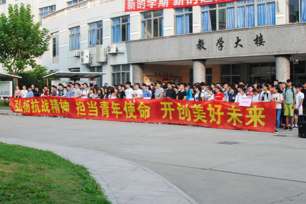 升旗仪式上,建工系辅导员胡云江老师作为教师代表发言,他对学生提出了殷切希望,希望济光学子能激发爱国热情、担当青年使命、成为有理想有志向的优秀青年。随后,沈忆春同学代表学生发言并带领全体同学庄严宣誓:时刻秉承“修德、强技、求新、乐业”的校训,努力弘扬抗战精神,热爱祖国,遵纪守法,严于律己,求实上进的济光学子风采,为实现中华民族伟大复兴的中国梦努力。