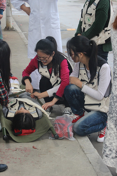 本次演练区域为1号宿舍楼的3、4、5、6、13层男生寝室。上午10点30分,消防车停至宿舍楼下,云梯车进入指定位置,民兵战士进入指定位置并做好引导楼内学生快速撤离“火灾”现场的准备。我院后保处处长凌龙、副处长金明华现场指挥,杨行消防中队14名消防官兵亲临第一线,医务室、红十字救援小组成员、火警专管警员和我院建筑系、机电系的师生共700余人参加演习。