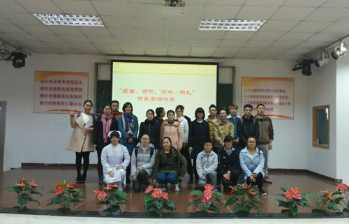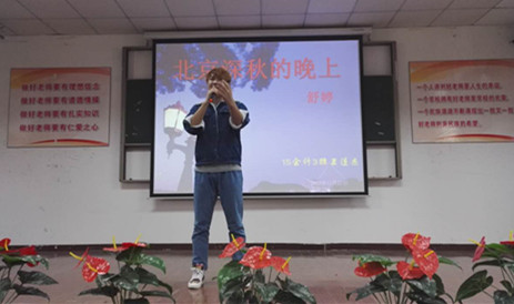 由团委主办、悦书明礼社承办的以“爱国、荣校、悦书、明礼”为主题的朗诵大赛决赛11月27日下午在第一阶梯教室顺利举行。学生处处长王琛老师,评委团团委副书记吴海燕老师、教务处王阳华老师、思政部姜洁晶老师、悦书明礼社指导老师思政部谢国日老师、悦书明礼社社长朱聪聪同学,以及社团成员和来自各系的观众出席了本次活动。