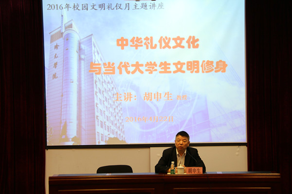 为大力宣传中华民族优良传统文化、促进校园精神文明建设、提升大学生的文明道德修养,4月22日下,由我院学工部组织,上海大学人才学院教授、著名社会学家胡申生教授所做的《中华礼仪文化与现代大学生文明修身》主题讲座在我院报告厅开讲。作为我院2016年大学生校园文明礼仪月中一项重要活动,此次讲座吸引了思政部教师、辅导员以及学生共计200余人参加。