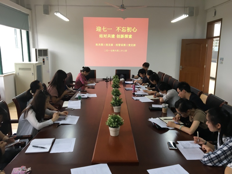 6月23日,经管系第三党支部与机关第三党支部开展“不忘初心,迎七一”党团共建结对活动。座谈会上,机关第三党支部书记戚爱华老师介绍了此次共建活动的活动计划,经管系第三党支部书记胡春宝老师交流了经管系大学生思想政治情况及学生对思政教育的愿望,最后人事处处长胡晓静老师对两个支部的共建工作提出了要求和进一步开展的建议。