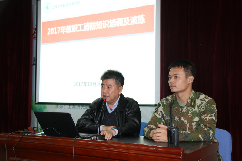 10月30日中午,我院教职员工消防知识培训及灭火演练在报告厅举行。宝山消防支队杨行中队队长徐晓明带领6名消防战士来我院主讲消防知识并现场示范灭火演练,院长李永盛、副院长姚健敏、党委副书记王滟及一百余名师生员工参加培训演练。