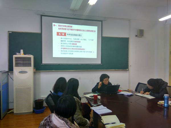 12月6日中午,基础部、思政部的全体党员老师汇聚教学楼212办公室齐上党课,学习新党章。此次党课由丁晓红主任讲授,她从“党章是全党必须遵守的总规矩”、“解读十九大对党章的修改”、“党员要对标党章作表率”等三个方面对新党章进行了解读。
