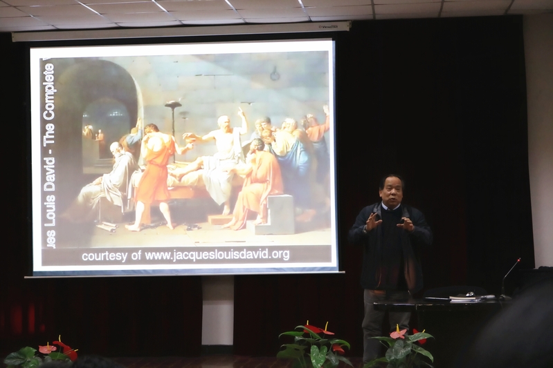 “青年兴则国家兴,青年强则国家强。青年一代有理想、有本领、有担当,国家就有前途,民族就有希望。中国梦是历史的,现实的,也是未来的,是我们这一代的,更是青年一代的。” 李院长从十九大报告中习近平总书记关于青年的论述说起并指出,理想是每一个人对人生幸福的基本向往,也是每一个人的基本权利,理想给人以生活的勇气,给人以成才的目标,向往总是尚未实现的和难以轻易实现的,它的确立受到外界的影响和干扰,需要时时修正与完善。随后,李院长以《习近平的七年知青岁月》为素材,结合今年暑假期间学院全体中层干部前往延安进行政治素养培训时拜访习近平总书记当年插队之地陕西延安延川梁家河的所观所感,向大学生鲜活讲述了年青人确立正确理想的重大意义。习近平总书记插队时带了两箱书,晚上点着油灯,通读中国通史、资本论、孙子兵法、军事装备方面等书籍的情景令大学生印象深刻,他利用自己的知识、能力和毅力开办铁匠铺、缝纫铺、打水井、建沼气池等为老百姓做实事,给老乡们讲故事,青年时期就与老百姓有这种鱼水关系的故事令大学生们感动。在说到人生的意义时,李院长旁征博引、妙语连珠,特别还以苏格拉底为例借助一幅经典油画来讲述他最终为捍卫真理而坦然面对死亡的壮举,引起了在场大学生的深入思考。