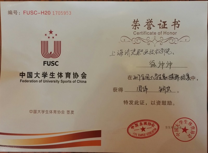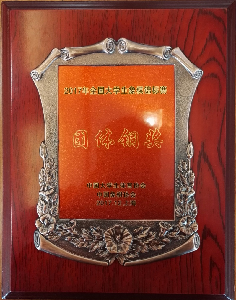 本次比赛男子组共赛9轮,女子组共赛7轮,团体由同队3人最好成绩计算团体名次。我院选手赛前在中华优秀传统文化教育体验中心集训了三周,包括周末时间都在对弈切磋,提升棋艺,感悟象棋精神。他们虽首次参加国家级大赛,但面对强劲对手,毫不松懈,认真下好每一局棋,最后以徐帅帅、陆继琛、周烨三位选手的较优成绩获得本次锦标赛团体铜奖,徐帅帅、陆继琛还参加了象棋辅导员培训班并获得优秀辅导员称号。