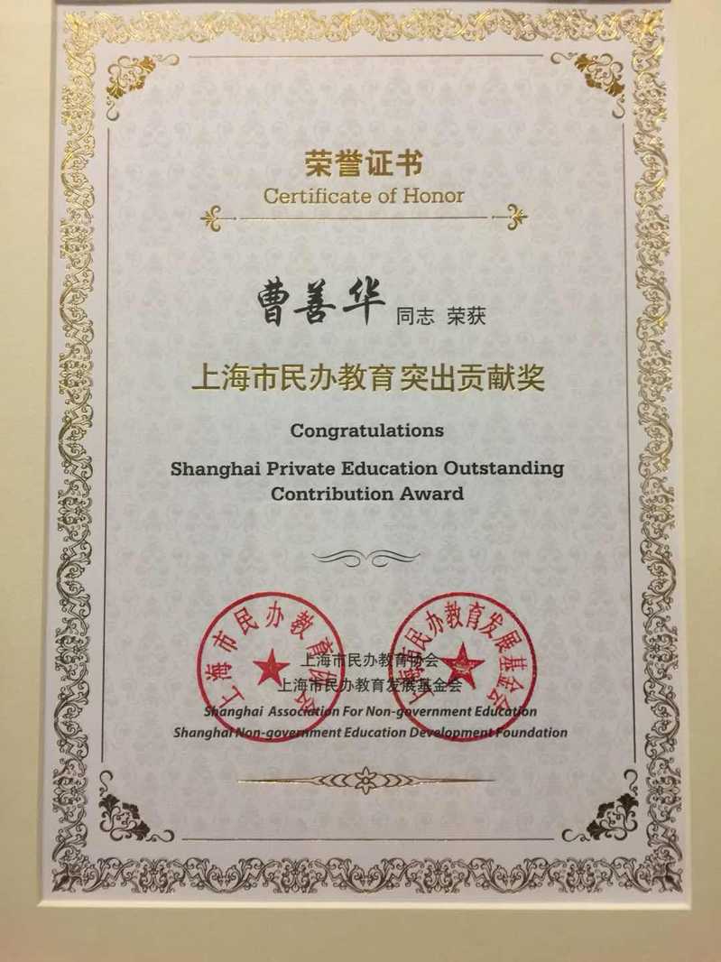 近日,上海市第三次民办教育工作会议在中国浦东干部学院举行,上海市副市长翁铁慧、教育部发展规划司司长刘昌亚、上海市副秘书长宗明、上海市教卫工作党委书记虞丽娟等领导出席会议。会上,我院副董事长曹善华荣获“民办教育突出贡献奖”。