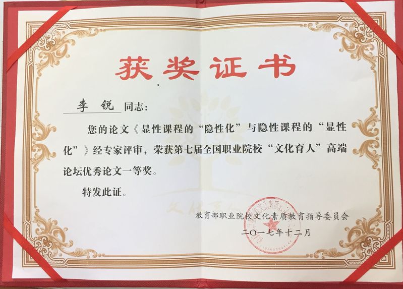 为进一步贯彻落实党的十九大精神,营造浓郁的学术氛围,教育部职业院校文化素质教育指导委员会于2017年12月23日组织开展了第七届全国职业院校“文化育人”高端论坛征文活动。活动得到全国职业院校的积极响应,经各校评选,共推荐报送论文298篇。我院基础部李锐老师的论文《显性课程的“隐性化”与隐性课程的“显性化”》脱颖而出,被专家评审为一等奖。