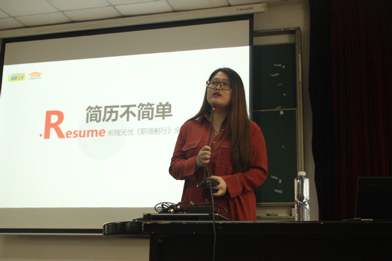 一份简历好似一块敲门砖,它是被面试者留给招聘者的第一印象。王宵老师在讲座的开场就通过“入职前自我推销的四个步骤”——简历、初试、复试、终试,表明一份好的简历对于找到自己心仪工作的重要性。讲座过程中,王宵老师用轻松幽默的话语从内容、措辞、模板等方面准确地指出一份好简历中应有标准及出彩之处;用简历实例做对比,认真分析其问题与不足之处,使得每一位同学在愉快的环境下学习到经验,同时提前感受到职场的严肃。此外,王宵老师还特别谈到邮件名称这一细节,提醒广大同学应当注重专业化、职业化。讲座结束之际,王宵老师也对在场的经管学子发出邀请,欢迎感兴趣的同学前往前程无忧实习、就业。