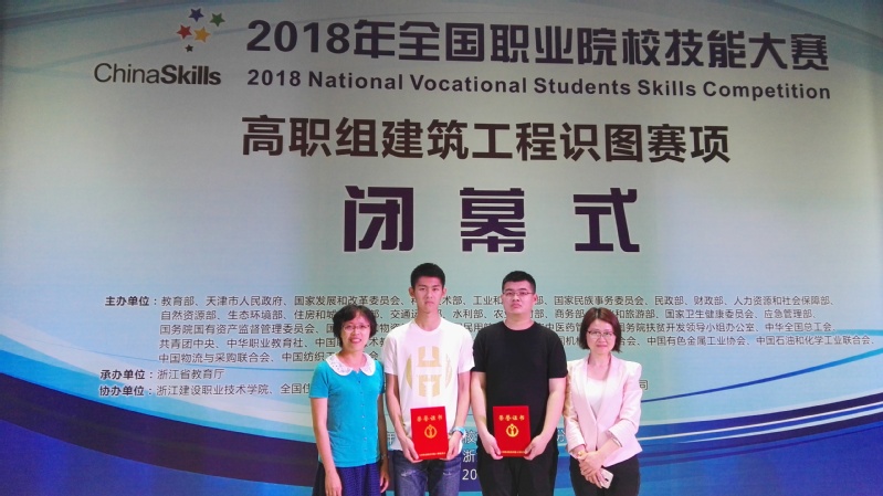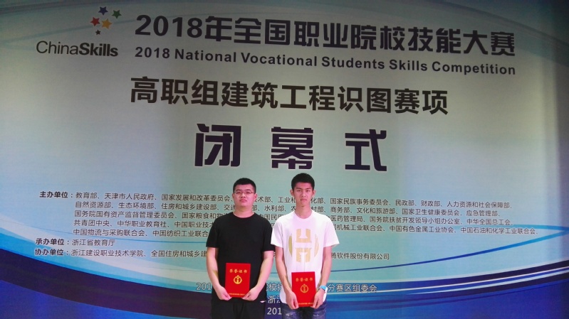 2018年全国职业院校技能大赛高职组“建筑工程识图”赛项比赛于5月26日在浙江建设职业技术学院举行,建工系高琦、丁子昊同学从来自全国30个省、市、自治区的104所职业院校队伍中脱颖而出,获得团体三等奖。