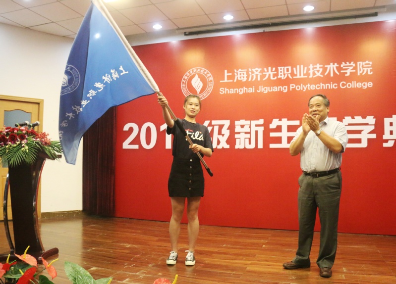 最后,李永盛院长为新生代表授旗。新生开学典礼在全体人员合唱《团结就是力量》的歌曲中圆满落幕。