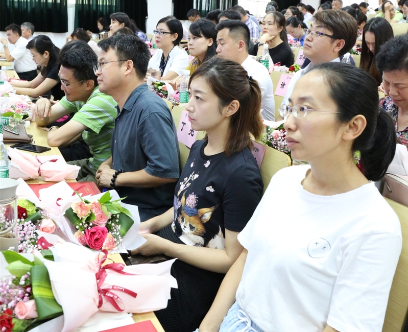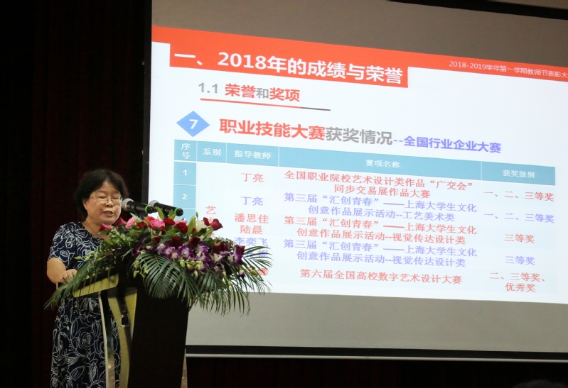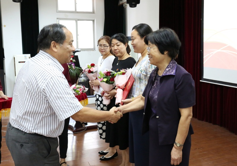 组织部长、人事处长叶新宣读2017-2018年度所获市教委、市级及以上奖励的人员名单,学院2017-2018年度“优秀教师”、“优秀辅导员”、“先进教育工作者”人员名单,以及学院2017-2018年度“优秀共产党员”、“优秀党务工作者”、“优秀党支部”名单,院领导及院系部负责人为获奖教职工颁发荣誉证书及献花。