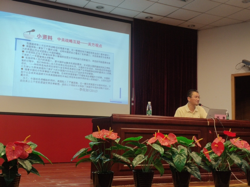 苏勇老师在讲座伊始分析了目前的世界形势以及中美等大国的国际关系新变化,详细阐明了国际格局正在面临从西方主导的格局向东西方均衡发展格局的加速转变中,表明了大国关系的不确定性。紧接着,苏勇老师通过引出“修昔底德陷阱”详细地说明了目前国际上中美、中俄、中欧、中日和中印的大国关系,从中引申出中美关系当中起重要影响的对华“规锁政策”等。在专题教学的最后一个环节,苏勇老师向同学们介绍了应对大国关系变迁的中国之策,以及要从根本上解决中美问题,我国应注意正确处理朝核与两岸关系等论题。