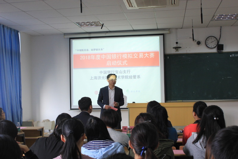 10月24日下午,经管系2018年度中国银行模拟证券交易大赛启动仪式在教学楼424教室举行。中国银行上海宝山支行副行长张捷先生、个人金融部主任邵玥女士、大华新村支行行长倪涛先生、经管系主任张迺英教授、系副主任林俊老师、经管系部分师生代表共同参加了启动仪式。仪式由金融管理专业主任周烨老师主持。
