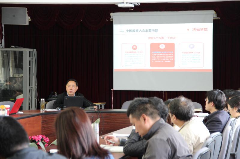 姜富明书记介绍了全国教育大会的历史背景,他从全国教育大会基本情况、全国教育大会主要内容、习近平心中的“好老师”、学习贯彻落实大会精神四个方面分别解读了习总书记的全国教育大会讲话精神,并与大家分享了习近平心中的“好老师”,明确5个“人”的工作目标,阐述了9个“坚持”,明确了1个根本任务,围绕1个目标要在6个方面“下功夫”,坚决克服5个“唯”,重点强调了作为一所高等职业院校应该高度重视应用型人才的培养。