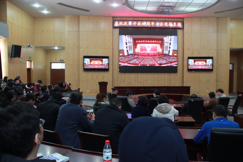 12月18日上午10时,庆祝改革开放40周年大会在人民大会堂举行,中共中央总书记、国家主席、中央军委主席习近平出席大会并发表重要讲话。按照学校党委的统一部署要求,12月18日上午10点我校党委中心组、机关党员干部、学生代表等集中在圆形会议室,各党总支、直属党支部、学生党支部分布在院系会场认真观看庆祝改革开放40周年大会直播盛况,有教学任务的师生则利用午间、课余时间通过网络方式收看实况转播。
