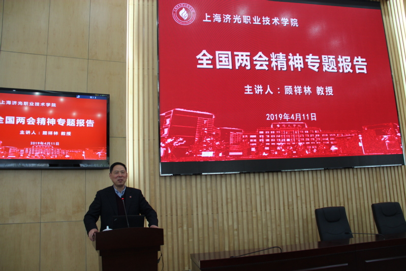 顾祥林教授报告的题目是《建言资政、凝聚共识——参加2019年全国两会体会》,他首先简要介绍了两会审议、讨论的主要内容,向大会传达了习近平总书记在看望全国政协文化艺术界、社会科学界委员时的讲话精神:坚持与时代同步、坚持以人民为中心、坚持以精品奉献人民、坚持以明德引领风尚。随后,顾教授分别讲述了他亲身参与审议政协常务会工作报告及提案工作情况报告、听取政府工作报告和两高报告、外商投资法的体会。最后顾教授也分享了两会中教育界委员关注的学前教育、老年教育、双一流建设、西部地区的教育以及师资队伍建设等几项热点的体会,也为我院高职教育改革与发展提供了重要参考内。