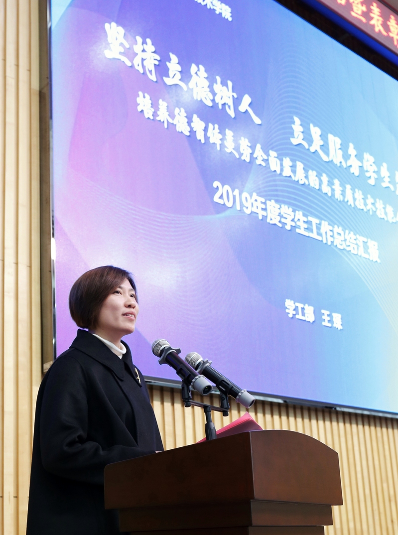 会上,学工部部长王琛分别从大学生思想政治教育、爱国主义教育、综合素质教育、辅导员队伍建设、就业创业工作以及各院系学生工作特色与亮点等六个方面,对学院2019年学生工作作了总结与回顾。团委专职教师张弛从思想政治引领、团学组织改革、校园文化建设三个方面汇报了我院2019年共青团工作。