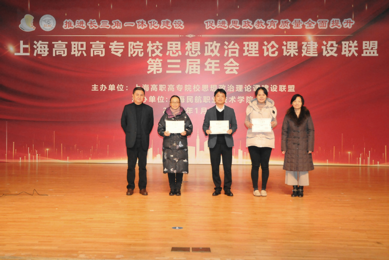 1月4日,上海高职高专思想政治理论课建设联盟第三届年会在上海民航职业技术学院举行,上海市各高职高专思政部主任、教学标兵、骨干教师代表等参加此次年会。上海市教委德育处副处长杨长亮在致辞中对上海高职高专院校思想政治理论课建设联盟所开展的工作给予了充分肯定,联盟副会长、上海震旦职业技术学院党委书记黄晞建主持表彰仪式,宣布我院张静老师获得第二届上海市高职高专院校《形势与政策》课教学设计比赛二等奖,同时被授予2019年度上海市高职高专思政课“教学骨干”称号。
