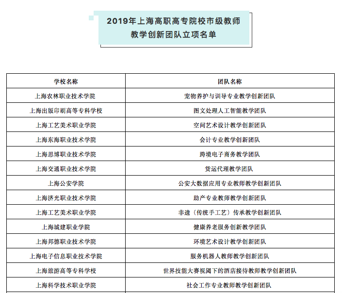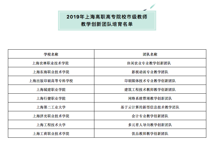 根据《上海市教育委员会关于做好2019年度上海高职高专院校市级教师教学创新团队申报工作的通知》(沪教委高〔2019〕58号),经学校申报、专家评审和网上公示,确定了2019年度上海高职高专院校(含办高职专业的本科院校,下同)市级教师教学创新团队立项和培育名单。我院助产专业教师教学创新团队入选2019年上海高职高专院校市级教师教学创新团队立项名单,会计专业教学创新团队入选2019年上海高职高专院校市级教师教学创新团队培育名单。