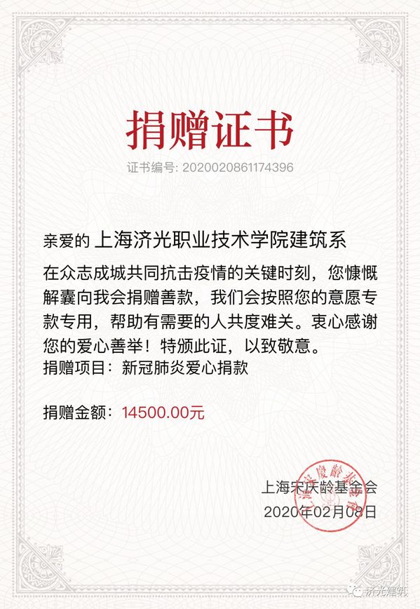 2月初,建筑系向全体教职工发起倡议,开展抗疫防控专项募捐,以支持疫情防治工作。倡议发起不到一天时间就收到教职工26人捐款14500元,于2020年2月8日全部捐款交由上海宋庆龄基金会新冠肺炎专项并定向援鄂,2月7日已经有教师直接向该机构捐款。全部款项及时用于前线战斗的医务人员和疫情防控工作。建筑系学生们也特别关注疫情的发展,虽然不能到一线去参加抗击疫情的工作,但他们纷纷慷慨解囊,自发主动向各类机构捐款捐物。已经有多名学生向各类机构捐款共计4466.89元。