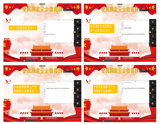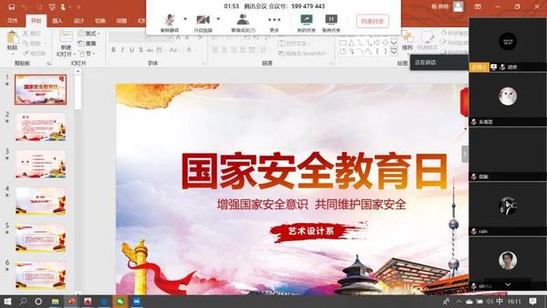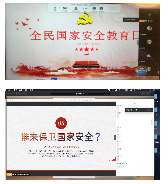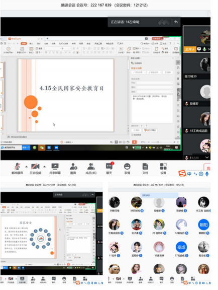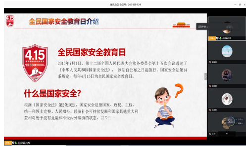 各院系围绕“坚持总体国家安全观,统筹传统安全和非传统安全,为决胜全面建成小康社会提供坚强保障”的活动主题,在“云”端以腾讯会议、QQ直播群、微信群交流的形式相继召开了线上主题班会,并组织开展线上知识竞赛,依托微信公众号,广泛开展以“国家安全”为主题的宣传,在全体学生中掀起了学习讨论的热潮。
