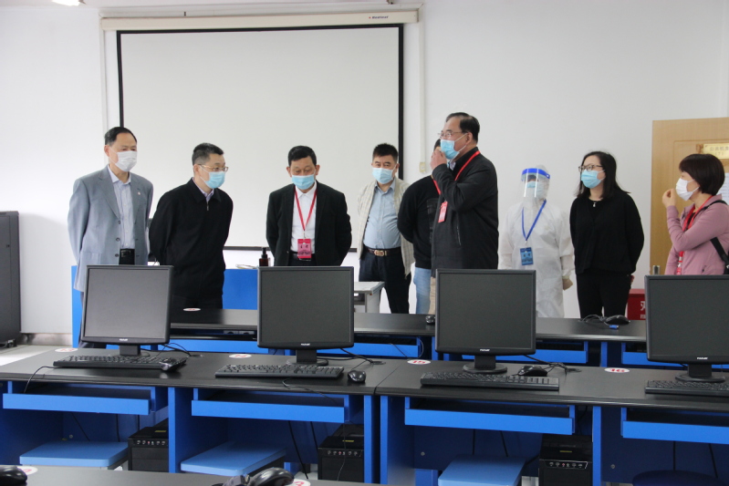 陆靖主任一行实地查看了考生入检区域、热成像测温通道、标准化考场及备用考场等防疫措施的落实情况,询问了应急处置流程、考场消毒保洁等措施落实情况,还看望了工作人员和考生。随后在学院考试指挥中心通过监控大屏查看了各考场的实时情况,并听取了招办主任孙遥关于此次专科自主招生考试疫情防控预案、考试中突发情况处理流程以及疫情防控下的各项考试考务工作的汇报。