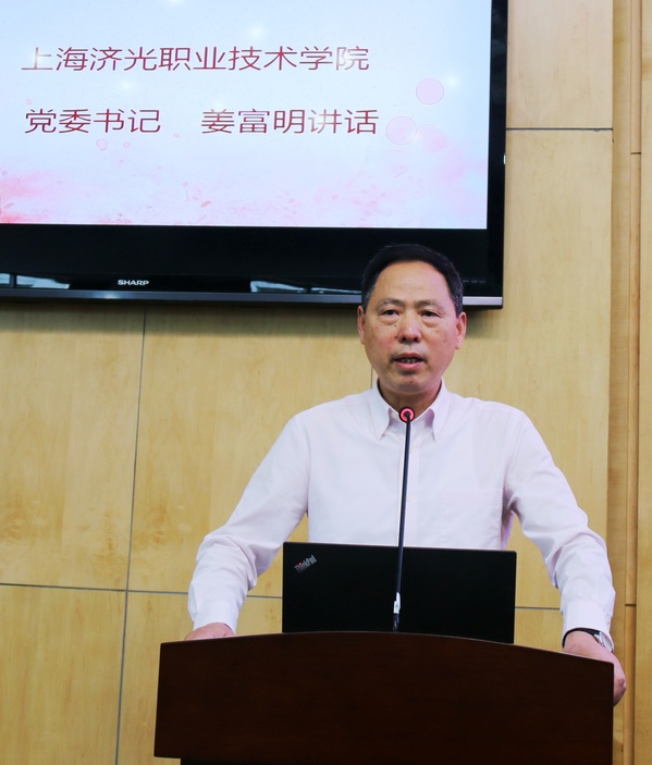 姜富明书记在开班仪式上讲话,他首先对同济大学领导出席本次研修班开班仪式以及给予济光学院的高度重视和积极支持表示热烈欢迎和衷心感谢。他指出,我院举办中层干部和骨干教师能力提升研修班是学院历史上的第一次,同时也是同济大学为高职院校量身定制开展培训的第一次。本次研修班课程包含了由16位各领域专家教授带来的专题讲座,内容涵盖党建工作、“四史”学习和高等职业教育改革发展等三大板块,对促进我院治理体系和治理能力的现代化必将发挥积极的作用。