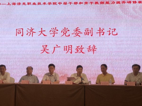 同济大学党委副书记吴广明在致辞中,回顾了同济大学和济光学院悠久的渊源,他代表同济大学向本次研修班全体学员顺利毕业表示热烈祝贺。吴广明副书记指出,本次中层干部和骨干教师综合能力提升研修班的举办是签订共建框架协议后,同济和济光两校联系辐射到专业建设、学院管理、校园文化多领域的重要学习活动,学员们以饱满的热情、积极的学习态度、严肃的学习纪律圆满完成了培训,不仅更新了视野,提升了能力和水平,更为提升济光高质量发展和师资队伍建设注入了新鲜的活力,在知识学习上和专业交流上都取得了丰硕的成果。吴广明副书记表示,本次培训受到两校的高度重视,同济大学按照济光学院发展需求以及中层干部和骨干教师需求量身定做培训方案,打造课程设计、课程设置和师资队伍;济光学院党政班子在贯彻落实《国家职业教育改革实施方案》和“双高计划”的时机下遴选了50位教师参加培训非常及时和重要,有着深远的意义。吴广明副书记同时对全体学员提出几点希望:一是要持之以恒地对待学习,树立终身学习的意识,做到学用结合;二是要敢于担当不懈奋斗,以民办高校教育发展为契机,落实好立德树人根本任务,办好社会主义大学,抢抓机遇,干事创业;三是要牢固树立团队意识,培养团队合作精神,彼此帮助鼓励,并祝愿全体学员在今后工作中坚持学习、既往开来、开拓创新、事业有成。