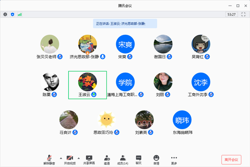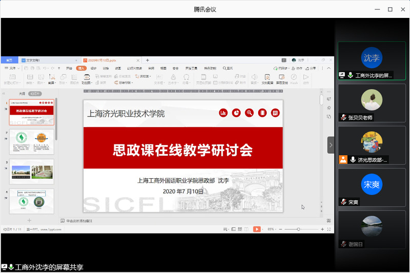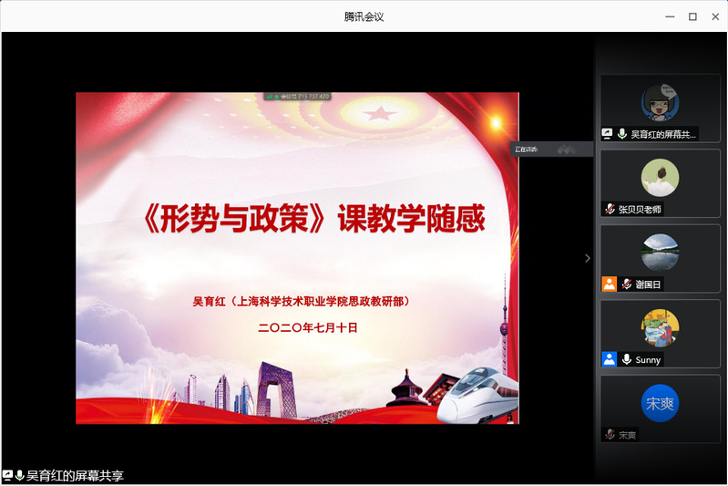 随后,校外专家也结合所在院校及个人本学期的在线教学工作进行了经验与心得分享。上海电子信息职业技术学院马克思主义学院副院长、上海高职高专思政课联盟副秘书长茌良计老师介绍了本校在疫情期间线上教学依托平台的特点,以及思政教师所开展的教学方式特点,并指出线上教学既从各个方面锻炼了老师,更是对学生自律性的考验,下学期将持续对线上线下教学相结合的教学模式进行探索;上海城建职业学院副教授刘素英老师从使用的在线教学平台、发挥教学团队力量、在线教学的优缺点以及展望等方面进行了经验分享;上海交通职业技术学院王淑云老师着重谈到了《形势政策课》的建设,从集体备课、教材选用、授课方式和考核方式等方面进行分享;上海工商外国语职业学院思政部主任沈李老师针对线上教学方式、学生不同阶段学习状态以及如何做相应调整、以及结合时事富有特色的实践教学工作进行了介绍;上海科技职业技术学院思政部主任吴育红老师着重从《形势与政策》课的角度谈了主题学科背景、讲课纵向贯通、直面慕课挑战、探索深度教学四个方面的话题;上海东海职业技术学院施晓玮老师围绕教学准备、教学管理、教学内容,并结合时事进行科学调整、考核方式等方面分享了在线教学的经验。之后的讨论交流阶段,上海电子信息职业技术学院马克思主义学院教师谢国日老师介绍了本校形势政策课的规范化建设,上海工商职业技术学院潘梅表达了要努力打造属于本校的特色教学资源。最后张静老师就本次研讨会作了总结。