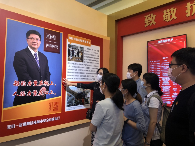 “我们众志成城”上海防控新冠肺炎疫情主题展览运用多种新媒体,展览近700多幅图片、200多组实物,展览分为“坚决打赢疫情防控的人民战争”、“全力以赴 科学防治”、“逆行而上 驰援武汉”等九个板块,全景式回顾了上海人民艰苦卓绝的抗疫历程。在“战疫家书”墙上,一封封写给援鄂医疗人员的家书,感动着在场的每一位观众,在“城市守护者”互动展板前,大家纷纷拿笔写下对抗疫英雄的感谢和祝福,感谢他们舍小家为大家、临危不惧最美逆行的大无畏精神。在校企合作单位吴淞口国际邮轮港董事长王友农事迹展板前,大家肃然默哀,聆听他生前感人故事,学习他的抗疫精神。