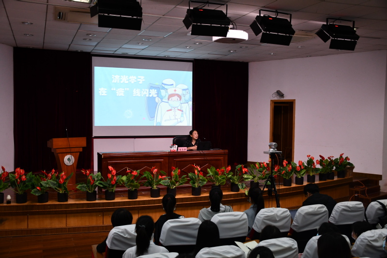报告开始,姚淳副院长首先向2020级学生展示了济光学子在上半年抗疫期间的志愿者风采,尤其是护理学院历届毕业生赴一线抗疫的飒爽英姿,向新生展现了不惧牺牲、不惧得失的济光人,在疫情期间如何身体力行、传递爱心,勇于奉献、担当社会责任。