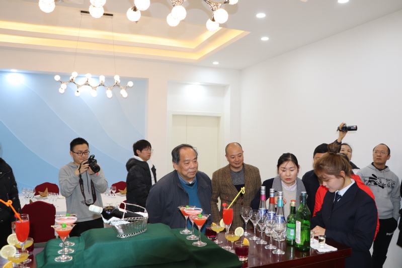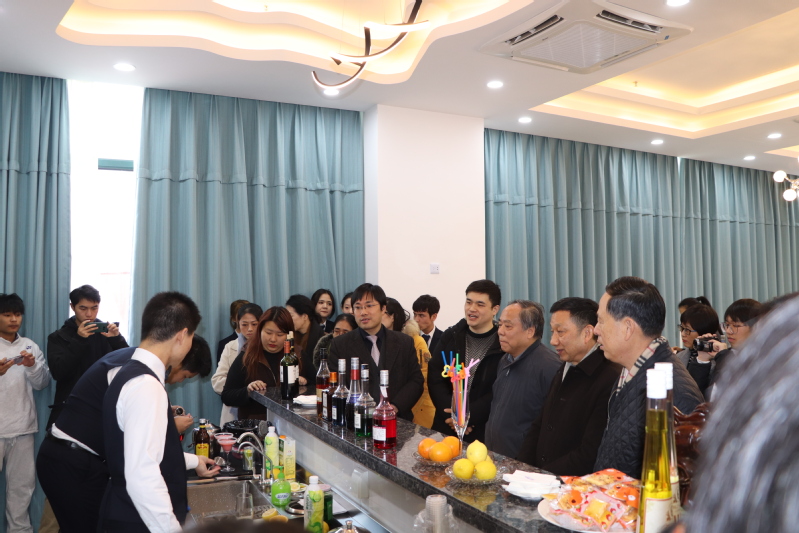 院系领导与老师们一起,共同观看了实训项目展示现场。第一站位于食堂二楼——酒店管理专业中西餐宴会服务实训室,19级酒店专业群8位学生展示了彩虹酒调制、烈酒盲品、茶艺、餐巾叠花四个项目。水平高超、精彩纷呈的技能展示赢得了在场师生的热烈讨论和阵阵掌声。校企合作共育的电商社团的学生们娴熟使用各类设备,由电商专业的尹逸慧和阿尼克•阿布都卡马力两位学生搭档现场演示了一场商品推广直播,另由电子商务社团团长、经管系学生会主席、电子商务专业学生帕尔哈提•胡达拜迪等几位学生在短短几分钟内剪辑出酒店专业实训展示短视频,展示了酒店专业才艺演示的精彩瞬间,也反映了电子商务专业学生对新媒体技术的掌握程度。展示活动中,学生帕尔哈提•胡达拜迪介绍了新实训室的建成对学生专业在学校掌握专业实践技能的意义,感受学校在培养高职专业学生的理念,并对社团的活动和现场制作的视频进行了讲解。学生自然而出众的表现让在场老师们赞不绝口。最后,胡院长和姜书记分别发言讲话,鼓励师生不断进取。
