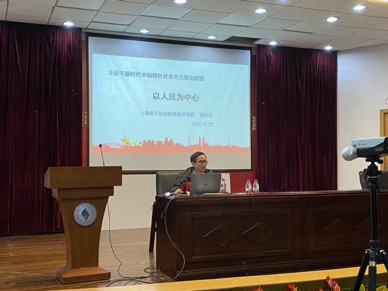 为深入学习习近平新时代中国特色社会主义思想,深化思政课教学改革,思政部邀请到上海电子信息职业技术学院谢国日老师为师生讲授《习近平新时代中国特色社会主义思想——以人民为中心》思政课。本次课程在信息中心与经管系电商直播平台的技术支持下,采用线上线下相结合的方式进行,所有2020级新生及辅导员参与了课程学习。