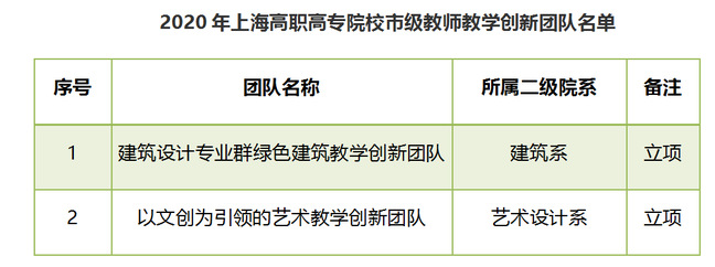 沪教委高【2021】6号、8号文《上海市教育委员会关于公布2020年度上海高职高专院校市级精品在线开放课程立项和培育名单的通知》《上海市教育委员会关于公布2020年度上海高职高专院校市级教师教学创新团队立项和培育名单的通知》,公布了2020年全市共有42个团队、35门课程获得立项建设。其中我校有2个团队和1门课程获得立项,分别是“建筑设计专业群绿色建筑教学创新团队”、“以文创为引领的艺术教学创新团队”、《绿色建筑入门》精品在线开放课程。截止目前,我校共有10个市级教学(教师教学创新)团队、14个市级精品(在线开放)课程。