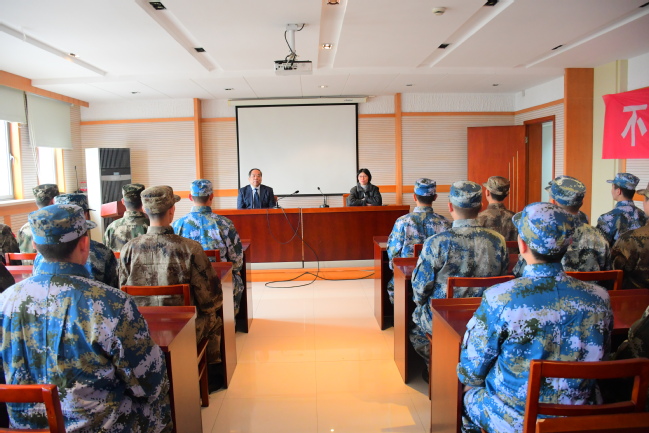 在役前训练结束前夕,学院李永盛院长和学生处处长兼武装部部长毛燕静赴基地看望即将出征的学生,勉励大家到部队后要一切行动听指挥,心理上要适应部队生活,完成从学生身份到军人身份的转变;要服从纪律,一切行动听指挥;要用所学的知识、坚强的毅力克服训练中各种困难;要积极完成部队所有科目,积极融入到部队生活,争取立功授奖,为母校争光。