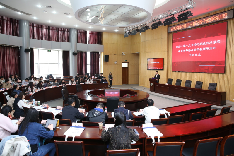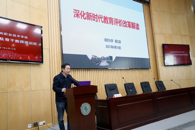 4月16日下午,我院中青年干部及骨干教师培训班在宝山校区圆形会议室举办开班式。本次培训班依托我院“民创计划”——“深化公民办高校共建机制协同推进‘三全育人’综合改革”项目与同济大学共同举办,旨在深入学习贯彻习近平新时代中国特色社会主义思想,牢记初心使命,落实立德树人根本任务,切实提升广大党员干部履职能力和教师业务水平,助力高职教育高质量发展,推动学院“十四五”规划开好局、起好步。同济大学继续教育学院党委副书记张俊生、我院党委副书记刘丽、院长助理、组织部部长姚桂芳以及全体培训班学员等出席了开班式。本期培训班首场讲座由同济大学发展规划部部长蔡三发作《深化新时代教育评价改革解读》专题报告,党委书记姜富明出席了报告会。