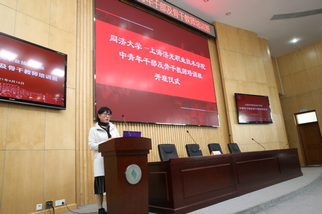 院长助理、组织部长姚桂芳在开班式上发言,她首先对同济大学给予济光学院干部培训工作的支持表示衷心感谢。她指出,依托济光与同济“1+2+3”党建共建载体,借助同济教育培训优质资源,度身定制了本期培训课程,包含了党史与党建理论、新时代教育评价改革与高职教育高质量发展,以及创新思维增强本领与治理体系治理能力现代化等三大模块,期待通过相关领域专家教授的系统阐释、独立见解以及研究成果分享,对我们的工作与学习有所启迪。日前,全国职业教育大会的召开,进一步强调了提高技术技能人才待遇,畅通职业发展通道,增强职业教育认可度和吸引力;同时更加强调,职业教育改革发展要走上提质培优、增值赋能的“快车道”。作为高职教育工作者,我们首先要深刻领悟习近平总书记职业教育工作重要指示精神,才能真正担负起党和国家赋予的培养更多高素质技术技能人才、能工巧匠、大国工匠的职责使命。希望大家带着课题、带着问题、带着思考参加培训学习。提倡鼓励支持各学习小组创新学习方式,延伸学习调研、加强交流、提高学习质量,将学习成果转化为实际工作的动力与成效,以优异实绩献礼建党100周年。