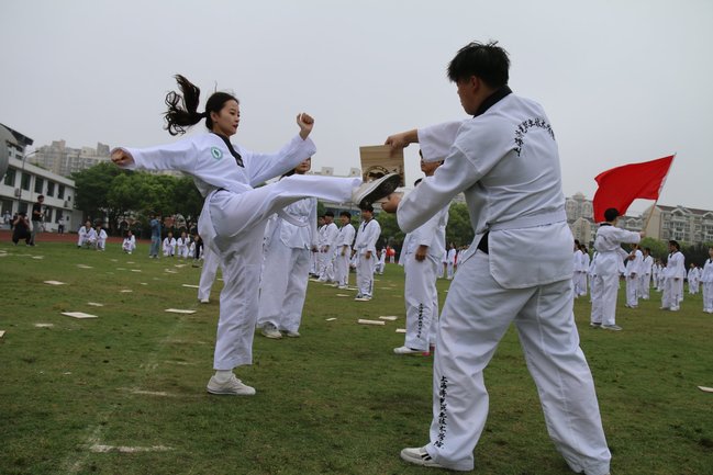 紧接着进行了全校师生的广播操比赛,全体师生精神饱满、队列整齐、动作规范,广播操比赛后的跆拳道表演更是极具观赏性,充分展示了我院学生斗志昂扬、积极向上的精神风貌。