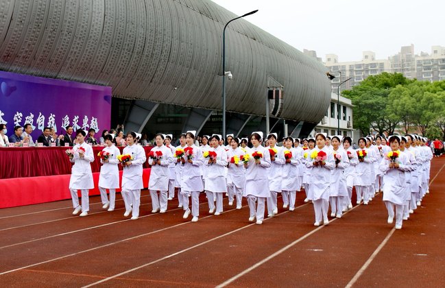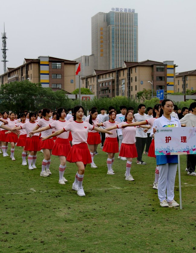 在开幕式上,国旗队、护理学院的鲜花队、各专业学生运动员代表队、各系(部)教工代表队依次入场,高喊口号,动作整齐划一,展示了饱满的热情。在庄严的升旗仪式后,胡展飞副院长宣布上海济光职业技术学院第十二届运动会开幕。
