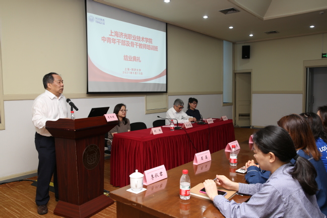 同济大学副校长顾祥林在结业仪式上致辞。他指出,济光学院和同济大学有着悠久的渊源,他代表同济大学向本期培训班全体学员顺利毕业表示热烈祝贺。济光学院众多的青年教师来到同济大学学习,不仅提高了能力,锻炼了本领,能够更好的为济光服务,同时也丰富了同济大学校园文化,提升了同济大学的声誉。希望全体学员能够保持终身学习的态度,不断丰富自己,把在同济感受到的文化浸润的氛围,潜移默化的应用到日后在济光的工作中。