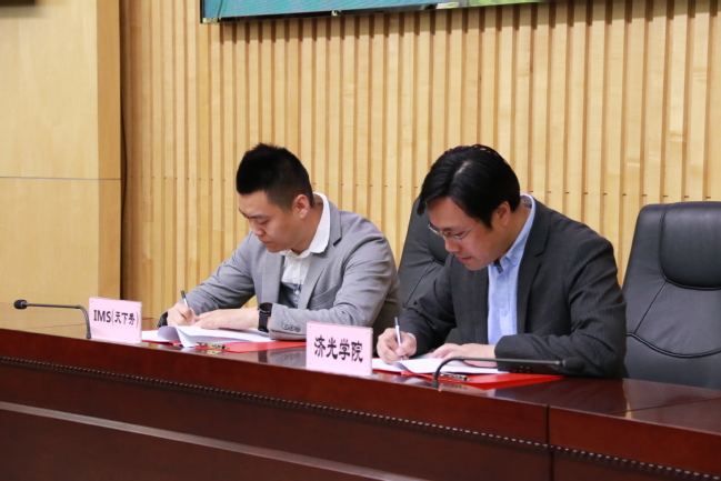 签约仪式上, IMS(天下秀)新媒体商业集团教育与认证事业部大区经理林旭和经管系副主任林俊作为双方代表在校企合作框架协议书上签字。经管系主任张迺英教授和IMS天下秀教育与认证事业部总经理郭擂分别致辞。双方表示,将在工作中坚持立德树人、创新培养模式和深度产教融合的合作原则,遵循教育规律和学生身心发展规律,把培育和践行社会主义核心价值观融入教育教学全过程;以专业课程衔接为核心,以人才培养模式创新为关键,紧密结合市场对电商人才的岗位需求,推进学校和企业双主体融合的职业教育体系;推动教育教学改革与产业转型升级衔接配套,加强行业指导、评价和服务,在教学标准开发、课程建设、师资培训、学生培养等方面以高校办学为主体,推进行业企业参与高校人才培养全过程,实现校企协同育人。