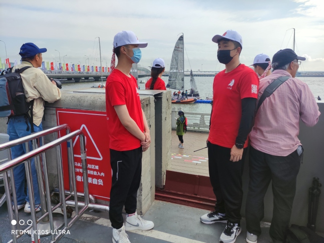 在国际帆船赛志愿者服务工作中,经管学子衣着整齐划一、精神饱满,用热情的态度和细致的服务助力上海邮轮国际帆船赛的顺利进行。