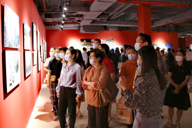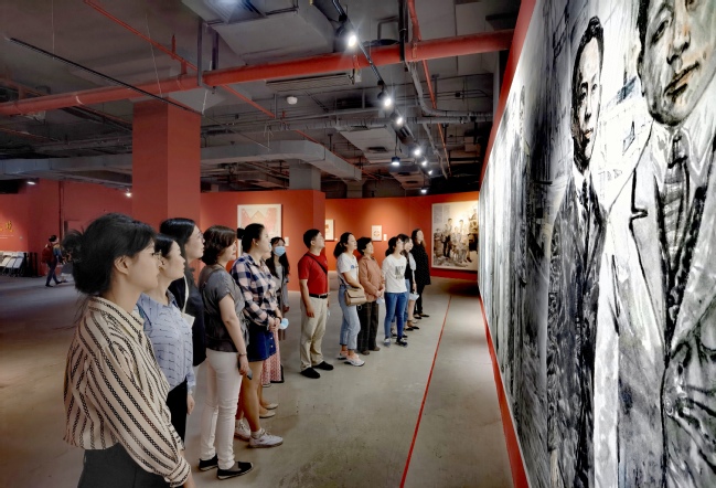 江风习习的杨浦江畔,拥有百年历史的毛麻仓库近日“华丽转身”,变成了艺术大展举办地。远远望去,这座红黄色砖体建筑外墙上覆盖了56根呈放射状发散的金线,熠熠生辉,正如黎明之际浮现天边的第一缕曙光。党员同志们跟随讲解员的引领,参观了“东方破晓、峥嵘岁月、民族脊梁、碧血丹心、换了人间”五大板块,从252位艺术家的388件作品,让我们看到了“艺术+党史”的完美交融,重温红色上海的百年风貌,感受上海的“红色基因”。