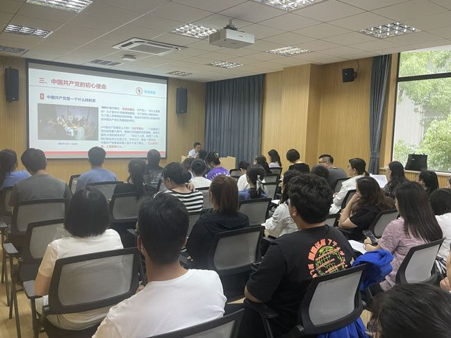 党课伊始,胡院长领学习近平总书记在党史学习教育动员大会上的重要讲话和《求是》杂志上发表的重要文章,表明了党史学习教育的重要性和地位。接着,胡院长从中国当时内忧外患的形势中阐述中国共产党的诞生是近代中国历史发展的必然。其后,胡院长带领大家思考了五个问题:中国共产党是一个什么样的党?中国共产党人是什么样的人?外国人眼中的中国共产党人?中国共产党发展的几个关键词?中国共产党为国家、民族作出了什么样的贡献?回答了中国共产党的初心使命这一核心命题。最后,胡院长分享了中国共产党的百年奋斗史,展望了新时期如何学党史、悟思想、办实事、开新局。