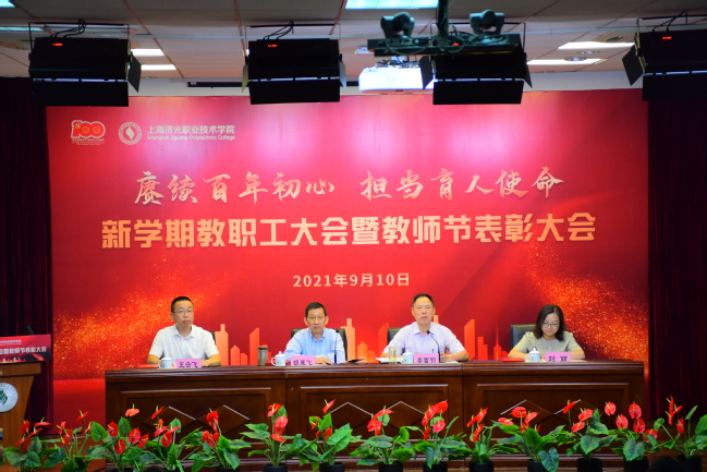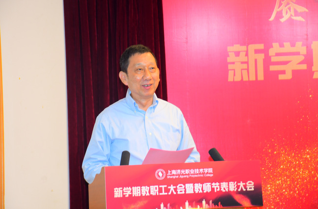 大会伊始,党委书记姜富明向全体教职员工致以节日诚挚的问候,他重点传达了2021年秋季上海高校党政负责干部会议精神,主要包括五方面内容:一是深入学习贯彻习近平总书记“七一”重要讲话精神,推进新时代党的教育方针落实到位;二是全面贯彻《中国共产党普通高等学校基层组织工作条例》,把高校建成坚持党的领导的坚强阵地;三是精准把握政治安全和意识形态工作面临的形势与挑战,为高校发展营造安全稳定政治环境;四是加强干部和人才队伍建设,夯实高等教育事业发展关键支撑;五是慎终如始做好校园常态化疫情防控,落细落实开学准备工作。他还从学校今后的发展方向、未来发展战略、发展战术提出了三点建议,希望全体教职员工全面贯彻落实党的教育方针,紧紧围绕国家和长三角发展战略对高素质技术技能人才的需求,积极对标对表,落实好立德树人根本任务,风雨同舟,共同努力,把济光学院做优做强、办出特色办出品质,实现内涵式高质量发展,为国家培养更多高素质技术技能人才。